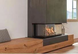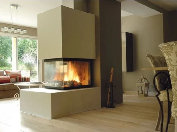 - Focare cu două geamuri (colț) – schimbă complet dinamica vizuală a camerei. Focul poate fi admirat din două unghiuri diferite, ceea ce le face ideale pentru amplasarea pe colț sau pentru delimitarea subtilă a două zone (de exemplu, living și dining). Creează un efect mai deschis și mai dinamic, fiind o alegere foarte apreciată în proiectele contemporane.